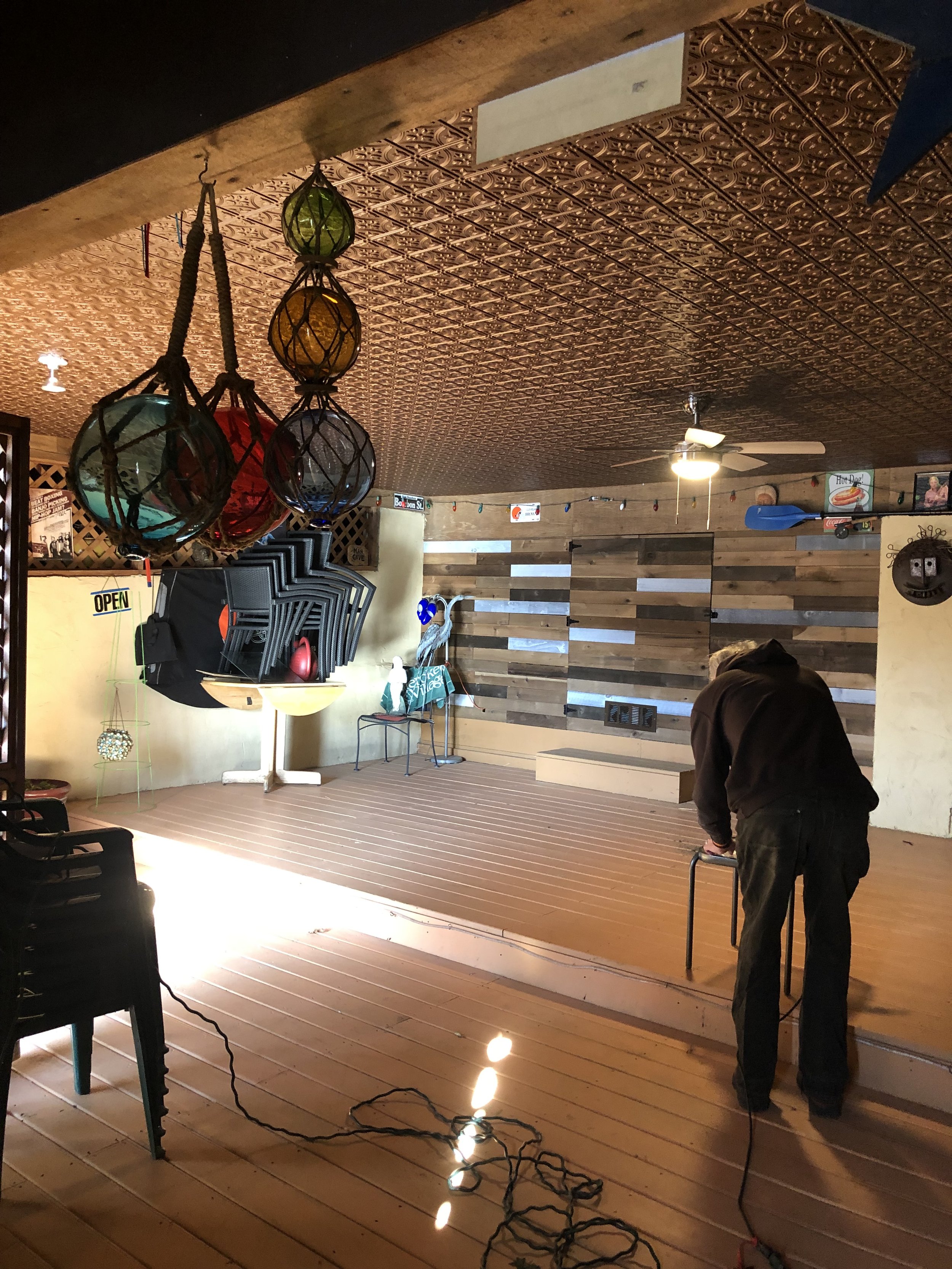 But all good things come to an end, and mid-November is the time when Al moves everything inside (furniture, decorations, etc.) to higher ground (on top of the bar) and slaps boards across the front to keep the winter wind from blasting everything into a cold, hard freeze.